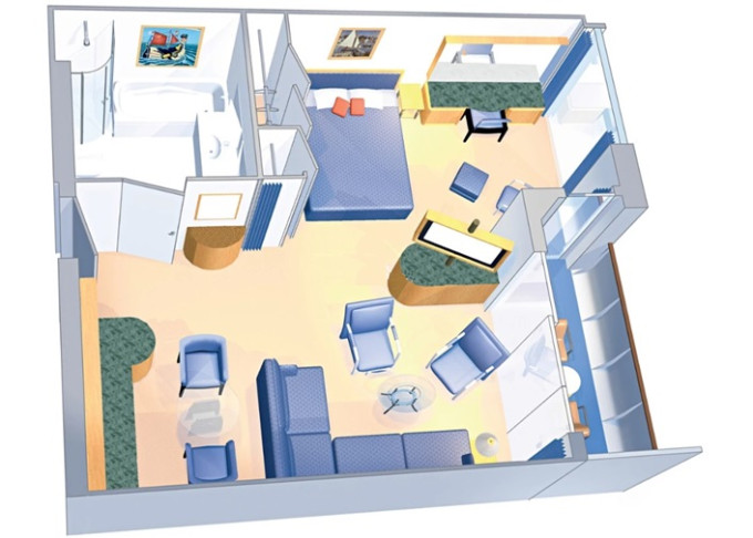 | VP - Ocean View Panoramic Suite (bez balkónu) 37 m². Panoramatické neotvárateľné okná. Oddelená časť s poschodovou posteľou. Extra WC. 12. paluba. Max 6 osôb. Výhody Suite. | 4 317 € 1 439 € za osobu |